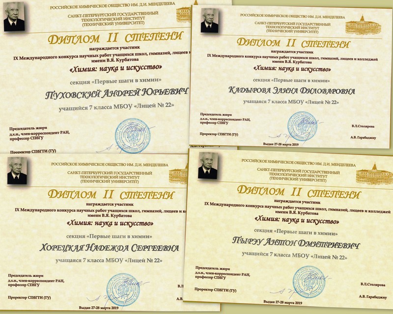27–28 марта 2019 года в Санкт-Петербургском технологическом институте проходила IX Международная олимпиада-конкурс научных работ учащихся 5–11 классов школ, гимназий и лицеев «Химия: наука и искусство» имени профессора Владимира Яковлевича Курбатова. Олимпиада-конкурс включена в перечень Министерства просвещения.