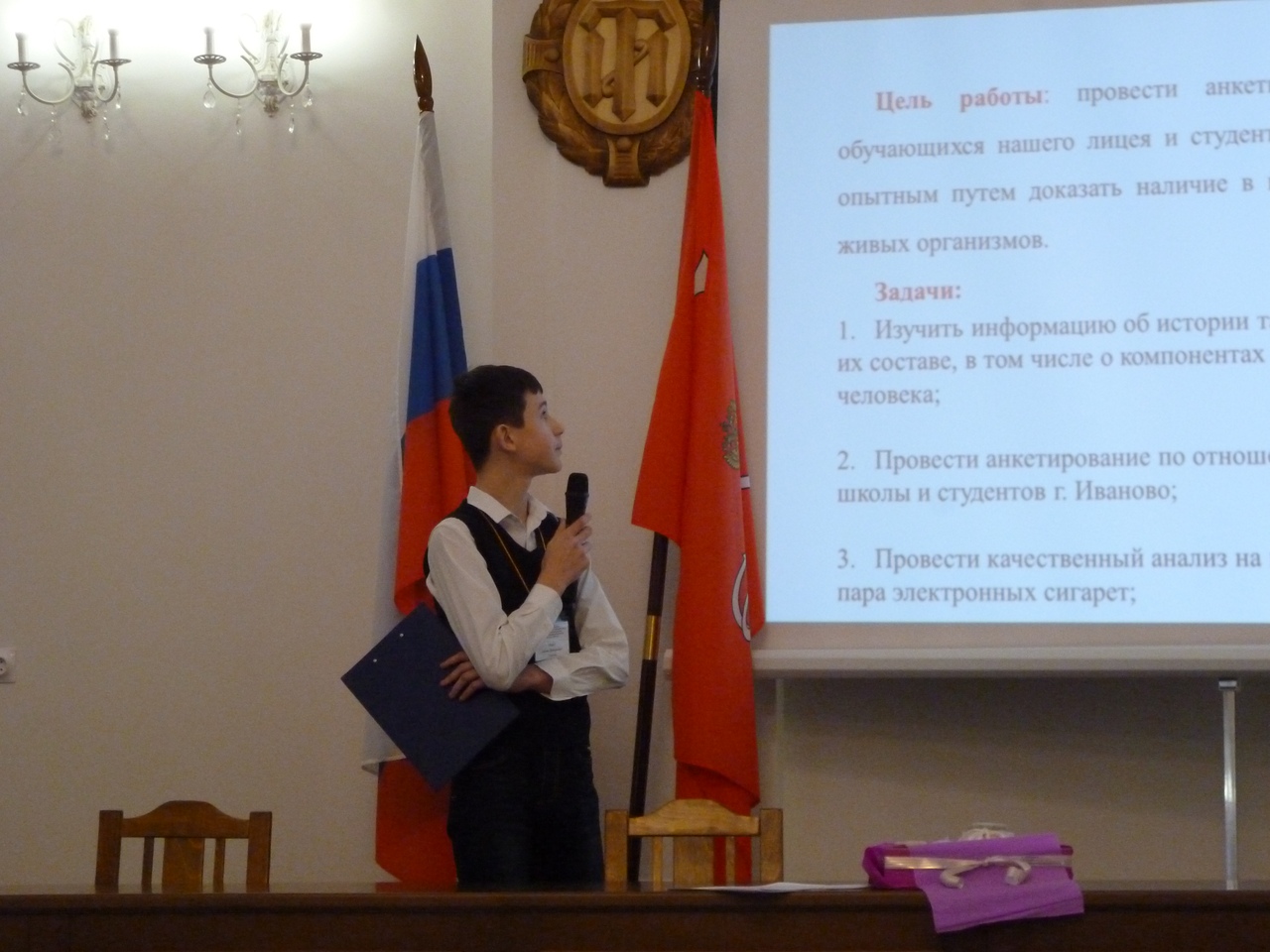 На данном мероприятии Иваново представляли МБОУ «Лицей № 22» и МБОУ «Гимназия № 30» с работами «Электронная и обычная сигареты: химический анализ», выполненная 7-классниками Хорецкой Надеждой, Пырэу Антоном, Кадыровой Элиной, Пуховским Андреем (лицей № 22) и «Сравнительный анализ некоторых видов растворимого кофе» (автор – Львова Лидия, гимназия № 30). Обе работы выполнены на кафедре органической и физической химии под руководством доцента Волковой Татьяны Геннадьевны. Хочется отметить бесценный вклад в работу по исследованию кофе Ирины Олеговны Талановой, кандидата химических наук, ассистента кафедры биохимии Ивановской государственной медицинской академии, которая была не только соруководителем, но и вдохновителем этого исследования.