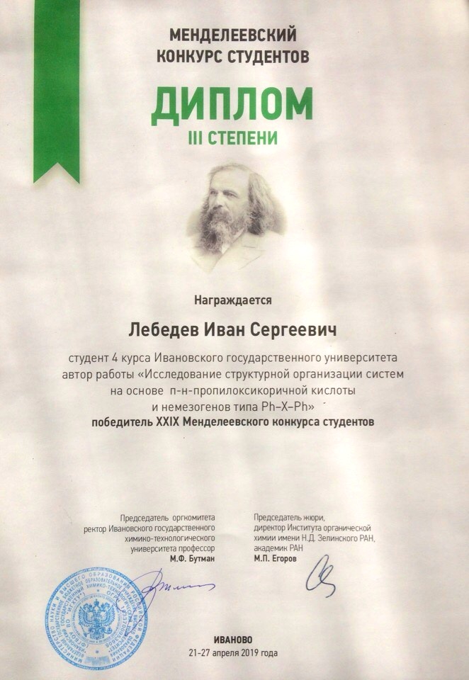 Участники прошли несколько этапов отбора: заочный и очный тур. Очный этап конкурса проходил с 21 по 27 апреля на базе ИГХТУ и включал стендовую сессию и устные доклады. До финального тура дошли лишь 40 участников из числа заявленных на первом этапе конкурса, среди них студент 4-го курса биолого-химического факультета Иван Сергеевич Лебедев. Его работа на тему «Исследование структурной организации систем на основе п-н-пропилоксикоричной кислоты и немезогенов типа Ph–X–Ph» была удостоена диплома III степени. Ивану также был вручен сертификат химико-биологического кластера «SCAMT».