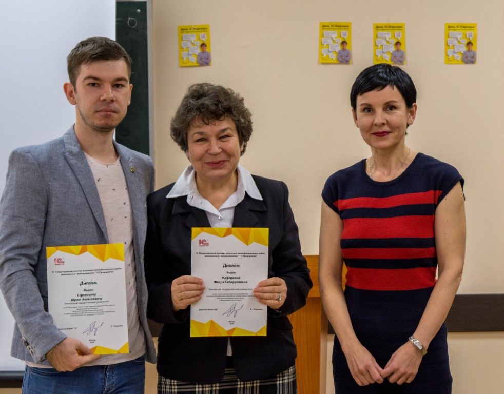 Руководитель ООО «Инициатива» Жукова Н.А. подвела итоги Открытого конкурса дипломных проектов, выполненных с использованием «1С:Предприятие 8». Участники конкурса Офилова А., Стрельцов Ю., Смирнова А., Еловских Н., Хлопков А. и Бойков А. (рук. – доценты Данилова С.В. и Жафярова Ф.С.) были отмечены Дипломами участников конкурса. Особое внимание Жукова Н.А. уделила призеру Стрельцову Ю.А., диссертация которого была принесла ему III место (при общей численности участвующих около ста) в Центральном Федеральном округе. Участники представляли учебные заведения 18 городов и областей, в том числе Москву и Московскую область, Владимирскую, Костромскую, Рязанскую, Воронежскую и др. Стрельцову Ю.А. и его руководителю доц. Жафяровой Ф.С. были вручены Дипломы призеров и премия.