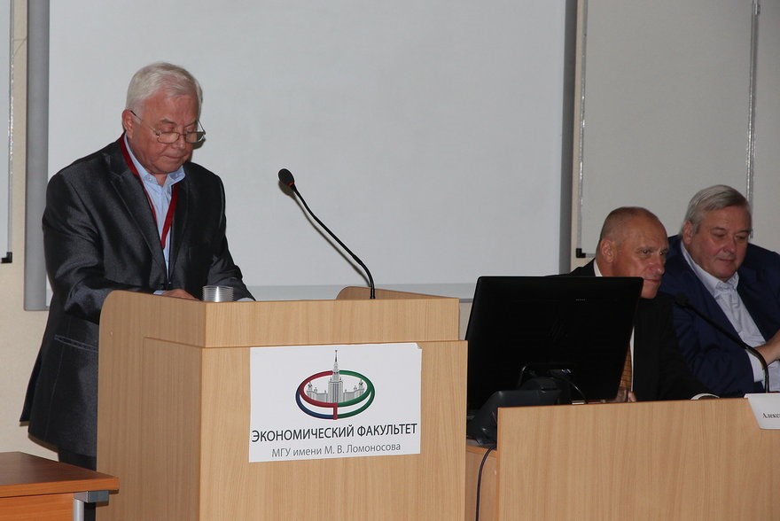 Пленарное заседание 18 мая 2018 г. (новый учебный корпус экономического факультета МГУ). Выступает д-р экон. наук, профессор, зав. кафедрой политической экономии экономического факультета МГУ имени М.В. Ломоносова Анатолий Александрович Пороховский. В Президиуме секции – д-р экон. наук, профессор, декан экономического факультета МГУ имени М.В. Ломоносова Александр Александрович Аузан и д-р экон. наук, профессор, зав. кафедрой истории народного хозяйства и экономических учений экономического факультета МГУ имени М.В. Ломоносова, главный научный сотрудник Института философии РАН Александр Георгиевич Худокормов.