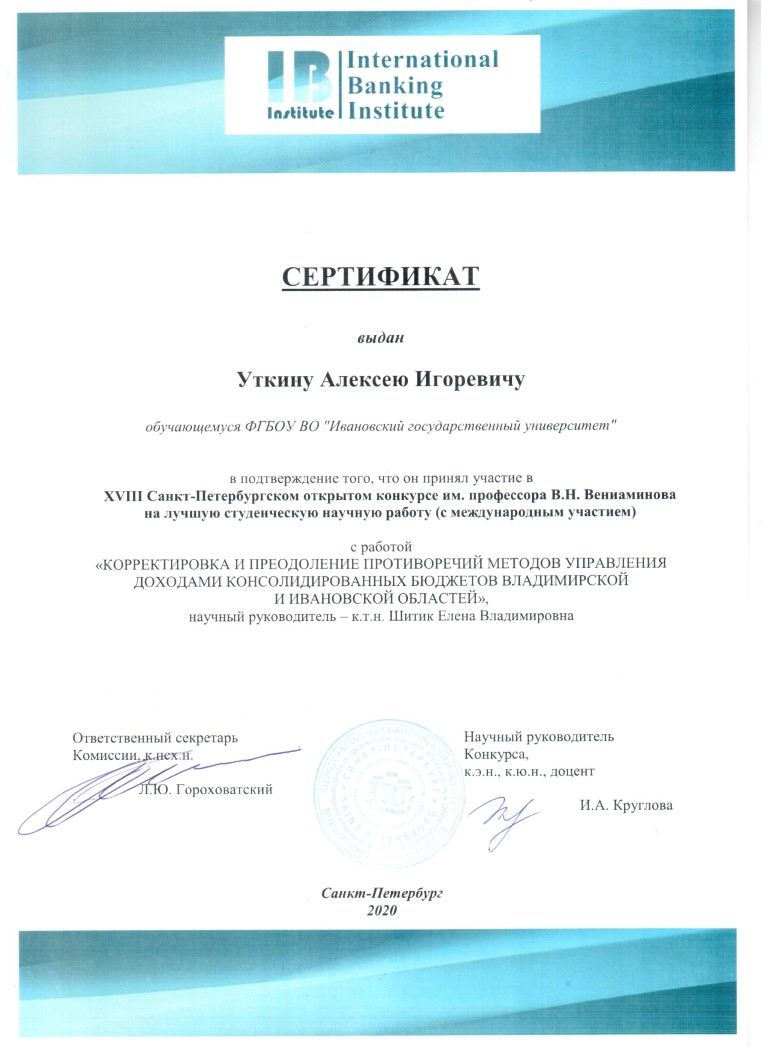 От Ивановского государственного университета участником XVIII Санкт-Петербургского открытого конкурса им. профессора В.Н. Вениаминова на лучшую студенческую научную работу (с международным участием) стал Алексей Уткин, магистрант 1 курса экономического факультета по направлению подготовки 38.04.01 Экономика, образовательная программа «Бухгалтерский учет, анализ и аудит». В рамках направления «Экономические исследования: точки противоречий и точки развития» наш магистрант представил на рассмотрение конкурсной комиссии научно-исследовательскую работу на тему «Корректировка и преодоление противоречий методов управления доходами консолидированных бюджетов Владимирской и Ивановской областей». Научный руководитель – кандидат технических наук, доцент кафедры экономического анализа и бухгалтерского учета Шитик Елена Владимировна. Алексей Уткин получил сертификат участника, подписанный научным руководителем Конкурса, проректором по научно-образовательной деятельности Международного банковского института Кругловой Инной Александровной и ответственным секретарем Комиссии, руководителем центра организации НИР Международного банковского института Гороховатским Леонидом Юрьевичем.