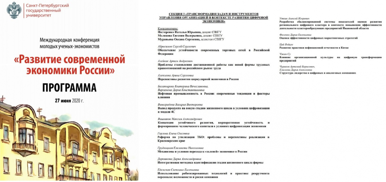 27 июня 2020 года в рамках Симпозиума состоялась Международная конференция молодых ученых-экономистов «Развитие современной экономики России». Цель проведения конференции – объединение усилий бакалавриантов, магистрантов, аспирантов для развития и реализации направлений Национального проекта «Цифровая экономика России 2024» и Стратегии научно-технологического развития Российской Федерации. Основной задачей мероприятия являлось определение направлений макроэкономической политики и механизмов государственного регулирования для формирования национальных конкурентных преимуществ.