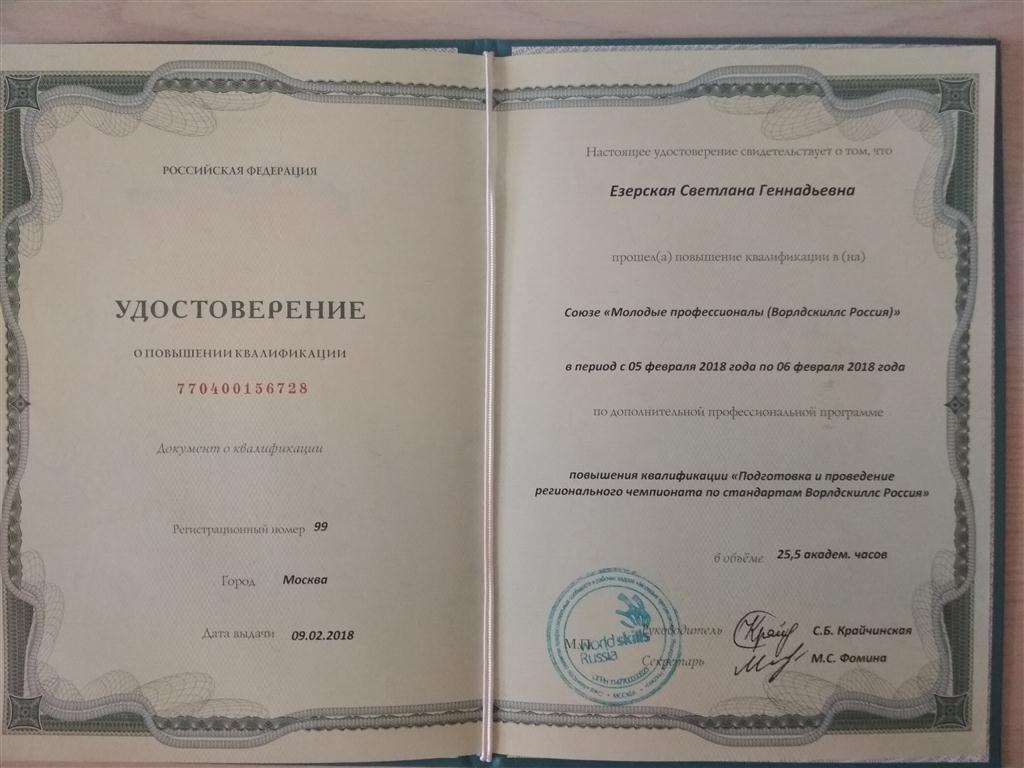 Доцент кафедры экономики и организации предпринимательства ИвГУ, руководитель детского бизнес-инкубатора МАУ ДО ЦТТ «Новация» Езерская Светлана Геннадьевна 5–6 февраля 2018 г. прошла очное обучение и тестирование по программе повышения квалификации Академии Ворлдскиллс Россия «Подготовка и проведение регионального чемпионата по стандартам Ворлдскиллс Россия».