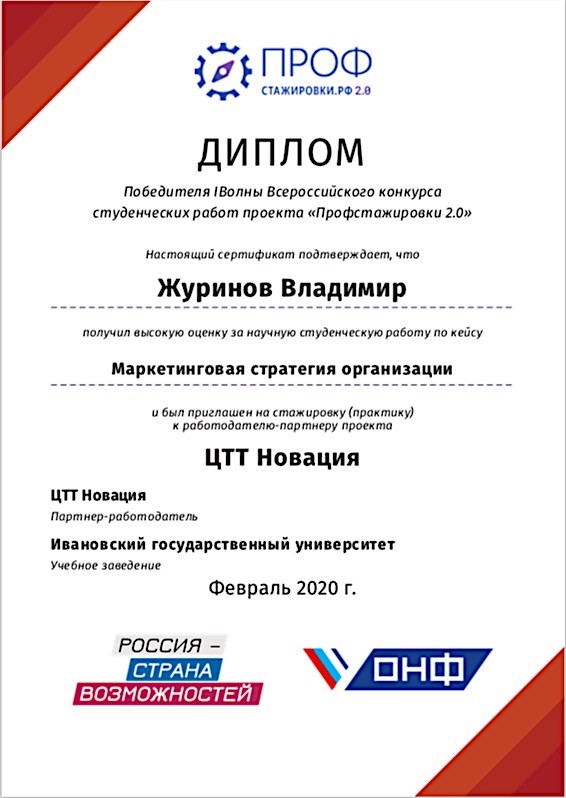 Дипломом победителя I Волны Всероссийского конкурса награжден студент 3 курса экономического факультета ИвГУ Журинов Владимир, обучающийся по программе бакалавриата «Экономика предприятий и организаций». Владимир получил высокую оценку за научную студенческую работу «Маркетинговая стратегия организации» и был приглашен к работодателю-партнеру проекта ЦТТ «Новация».