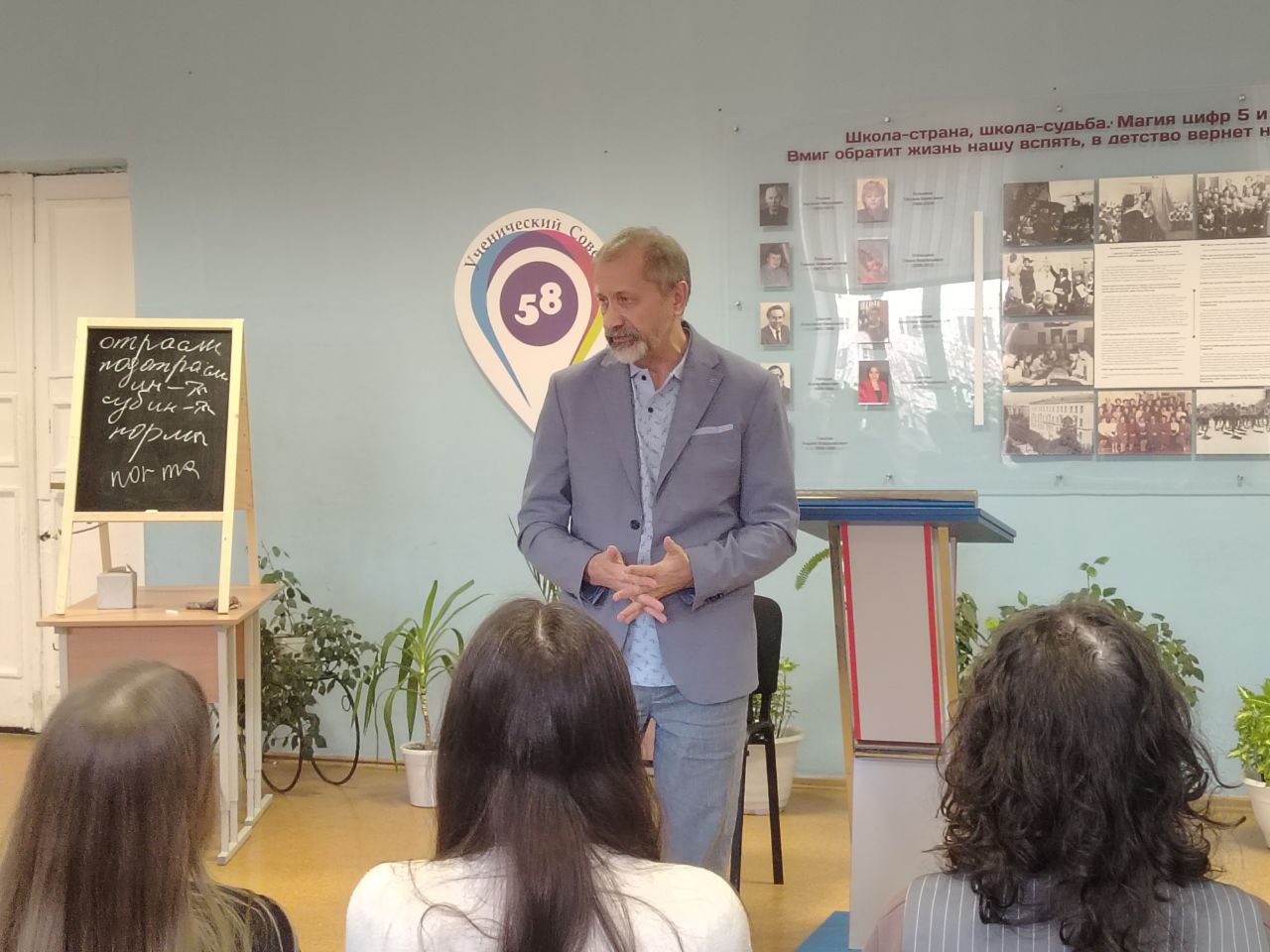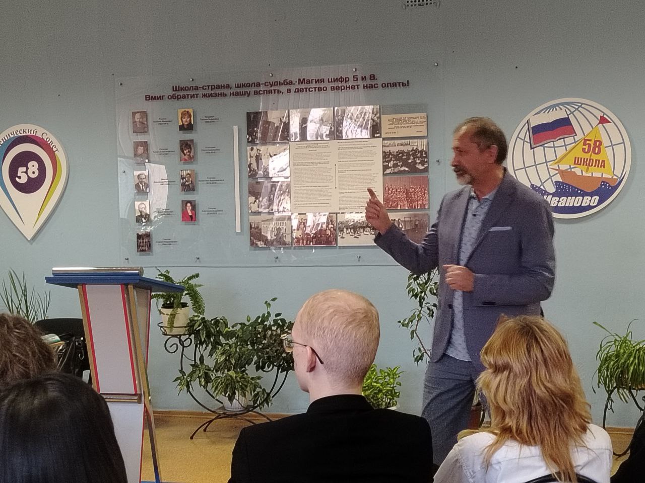 Директор МБОУ «Средняя школа № 58» г. Иванова Вера Николаевна Фатхуллина (выпускница факультета романо-германской филологии ИвГУ), тепло поздравила в лице Е.Л. Поцелуева всех преподавателей нашего классического университета и представила гостя лаконично: «Легенда юридического факультета ИвГУ».