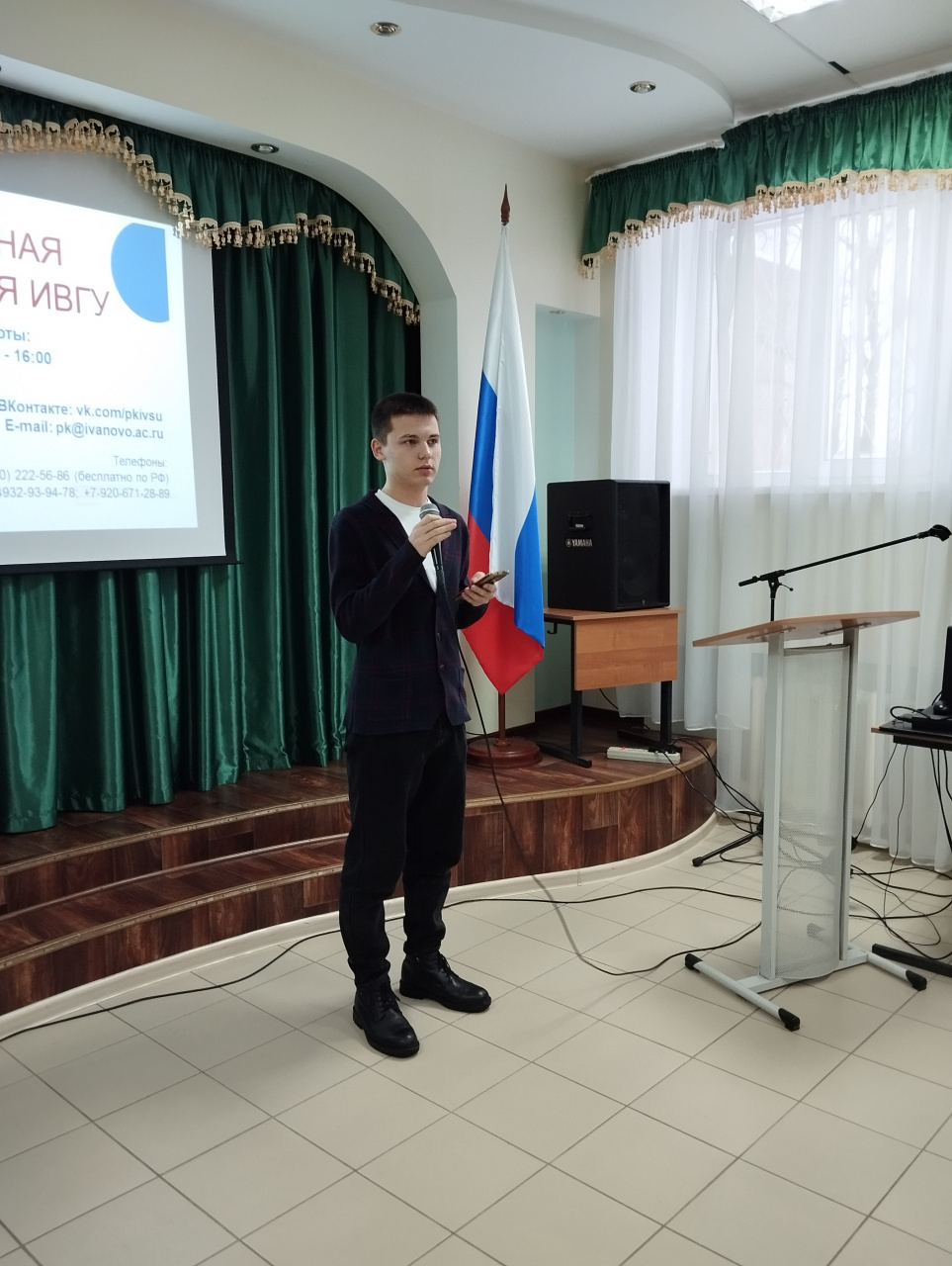 Школьникам подробно рассказали про структуру университета, реализуемые направления подготовки и образовательные программы, возможности обучения, выбора будущей профессии, научную, спортивную, общественную и культурную жизнь студентов ИвГУ.