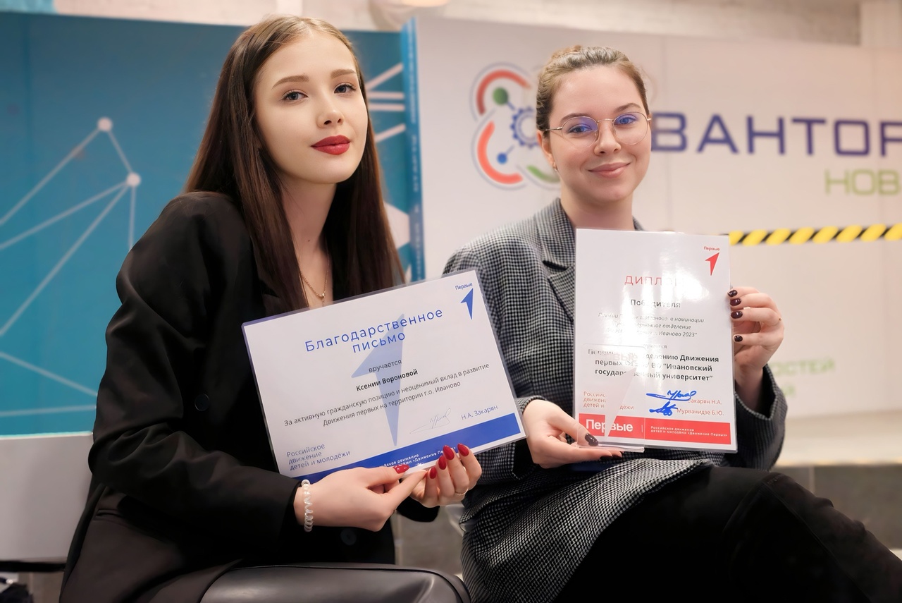 Благодарственные письма были вручены студентке ИвГУ Вороновой Ксении за активную гражданскую позицию и неоценимый вклад в развитие Движения первых на территории г.о. Иваново, а также проректору по молодежной политике и социальному развитию Сорокину Никите Дмитриевичу за активный вклад в развитие первичного отделения Движения первых на базе нашего университета. Никита Дмитриевич также был удостоен дипломом победителя премии Первых в номинации «Лучший наставник Первых г. Иваново 2023».