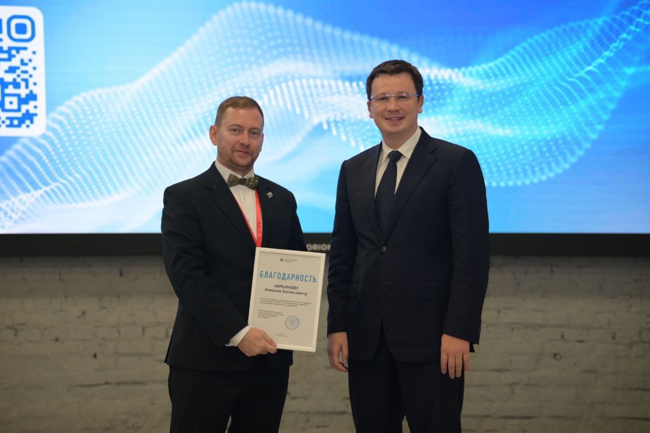 Депутат Государственной Думы ФС РФ Антон Немкин вручил благодарность Министра цифрового развития, связи и массовых коммуникаций Российской Федерации «За заслуги в развитии информационных технологий, поддержку отечественных ИТ-продуктов и большой вклад в цифровую трансформацию государственного управления» директоруМАУ ДО ЦТТ НОВАЦИЯ , региональному координатору проекта «Цифровая Россия», доценту Кафедры ЭиП; ИвГУ Алексею Евгеньевичу Кирьянову.