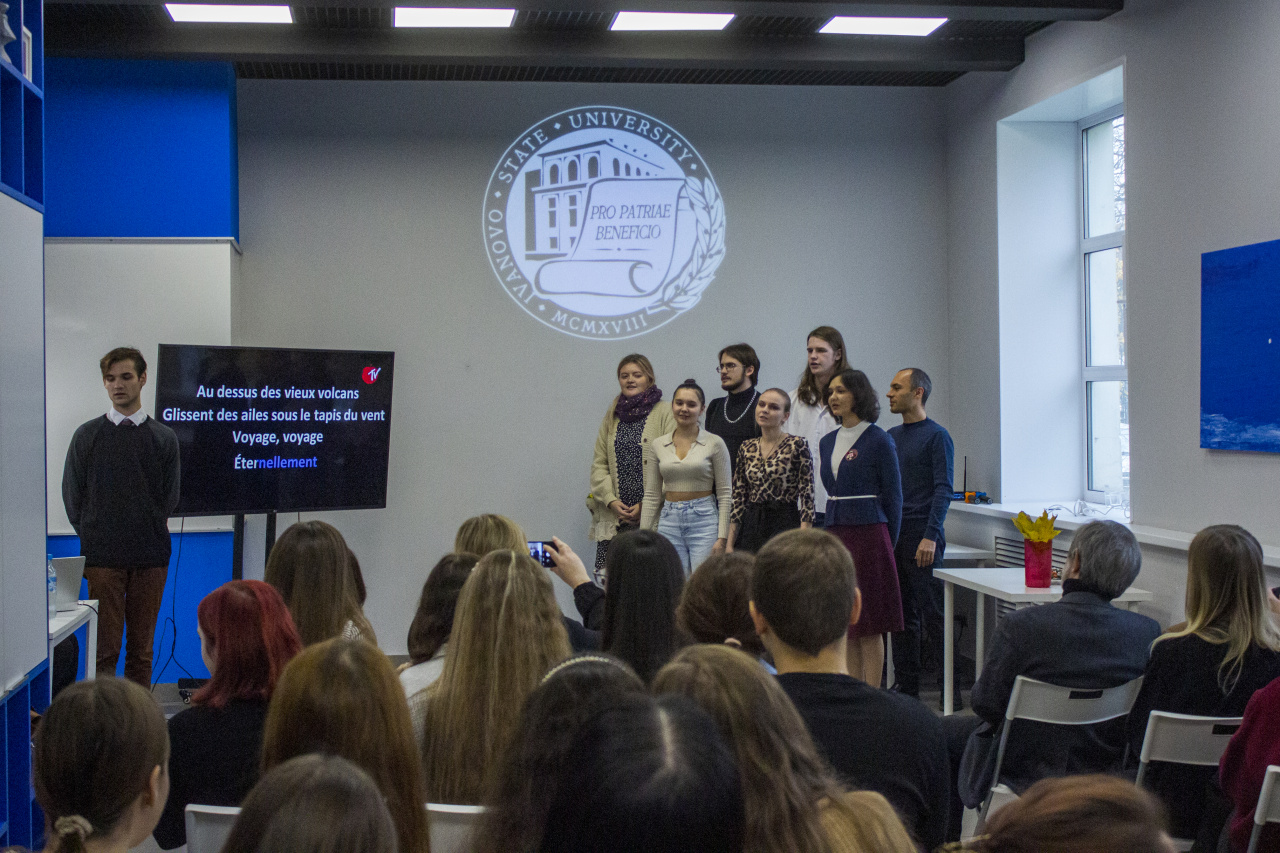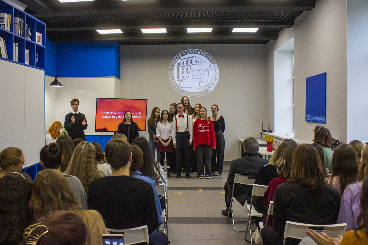 Начало учебного года – первая осенняя веха, и собравшиеся приветствовали её гимном студенчества Gaudeamus igitur при поддержке студентов 1-го курса 2-й английской группы. Лето растаяло, как шоколадное мороженое, мы попрощались с ним песней «Gelato al cioccolato» в исполнении 2-й английской группы 2-го курса. Эти хрупкие девушки стали настоящими атлантами нашей встречи, исполнив четыре песни на французском и два стихотворения на французском и итальянском языках!