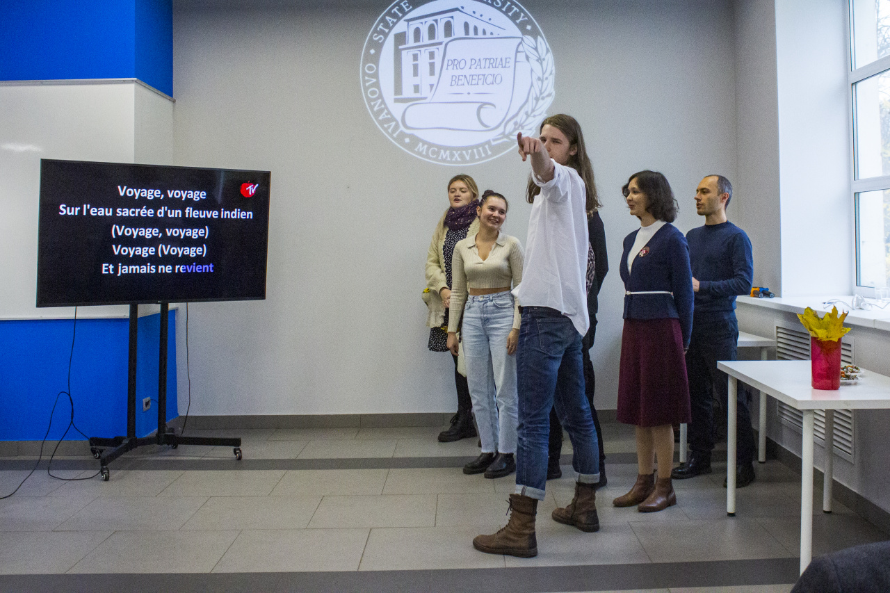 Наше путешествие в осенние романские страны началось с песни «Voyage, voyage». 1-я английская группа 4-го курса открыла нам звезду Михаила Якушина, исполнившего зажигательный танец-призыв к путешествию и сыгравшего роль Репки в одноименной сказке на французском языке, с юмором и талантом поставленной студентами этой группы.