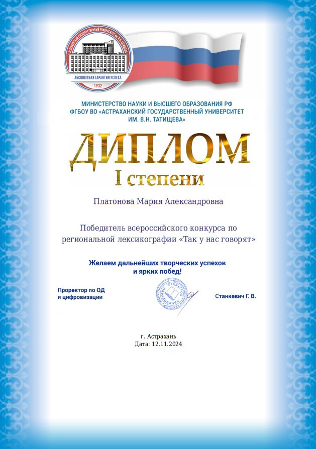 По условиям конкурса, организованного факультетом иностранных языков Астраханского государственного университета имени В. Н. Татищева, требовалось выполнить словарное описание лексики любого региона России на русском и английском языках.