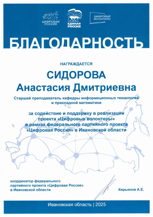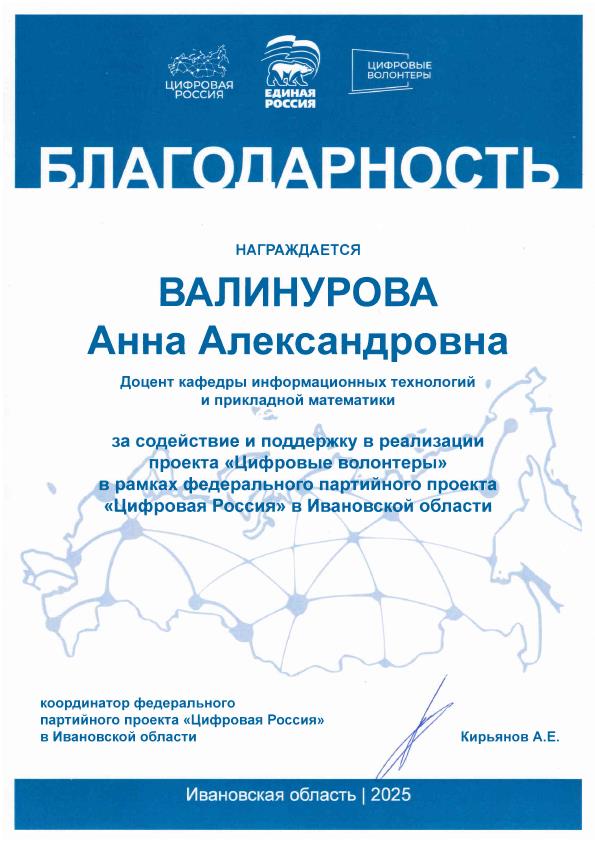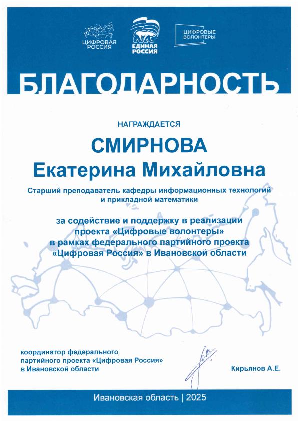 Ректору ИвГУ А.А. Малыгину и преподавателям кафедры информационных технологий и прикладной математики от имени координатора проекта «Цифровая Россия» А.Е. Кирьянова были направлены благодарности за содействие и поддержку в реализации проекта «Цифровые волонтеры» в рамках федерального проекта «Цифровая Россия» в Ивановской области.