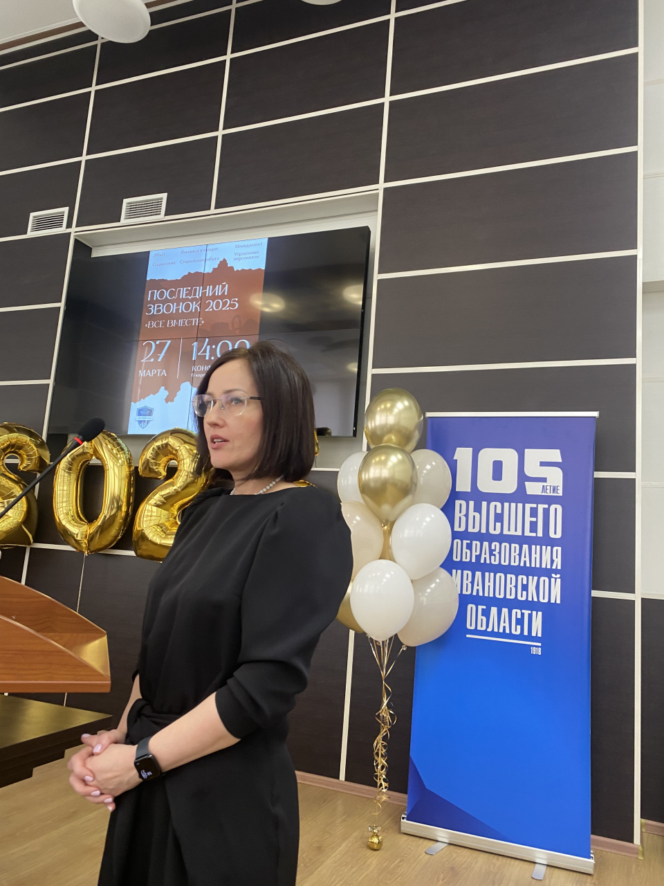 С приветственным словом выступила директор Института И.В. Курникова. Ирина Валерьевна напутствовала четверокурсников быть уверенными в своих силах: в стенах ИвГУ они получили бесценный багаж знаний, который станет основой для их карьерного и профессионального роста. Она представила презентацию о незабываемых четырех годах обучения, где «ВСЕ ВМЕСТЕ» преподаватели, сотрудники и студенты участвовали в самых разных мероприятиях, когда рядом с учебным процессом шли наши партнеры и помогали проводить нам профориентационные, творческие, спортивные встречи, открывать новые пространства и идти в ногу со временем. И было трогательно, когда ребята увидели себя на фотографиях вместе не только с преподавателями, но и с сотрудниками Федеральной налоговой службы, Федерального казначейства, Альфа-банка, Сбербанка, которые их ждут на работу. Было приятно, когда представители Сбербанка выступили с приветствием и поздравили старост всех групп с Последним звонком.