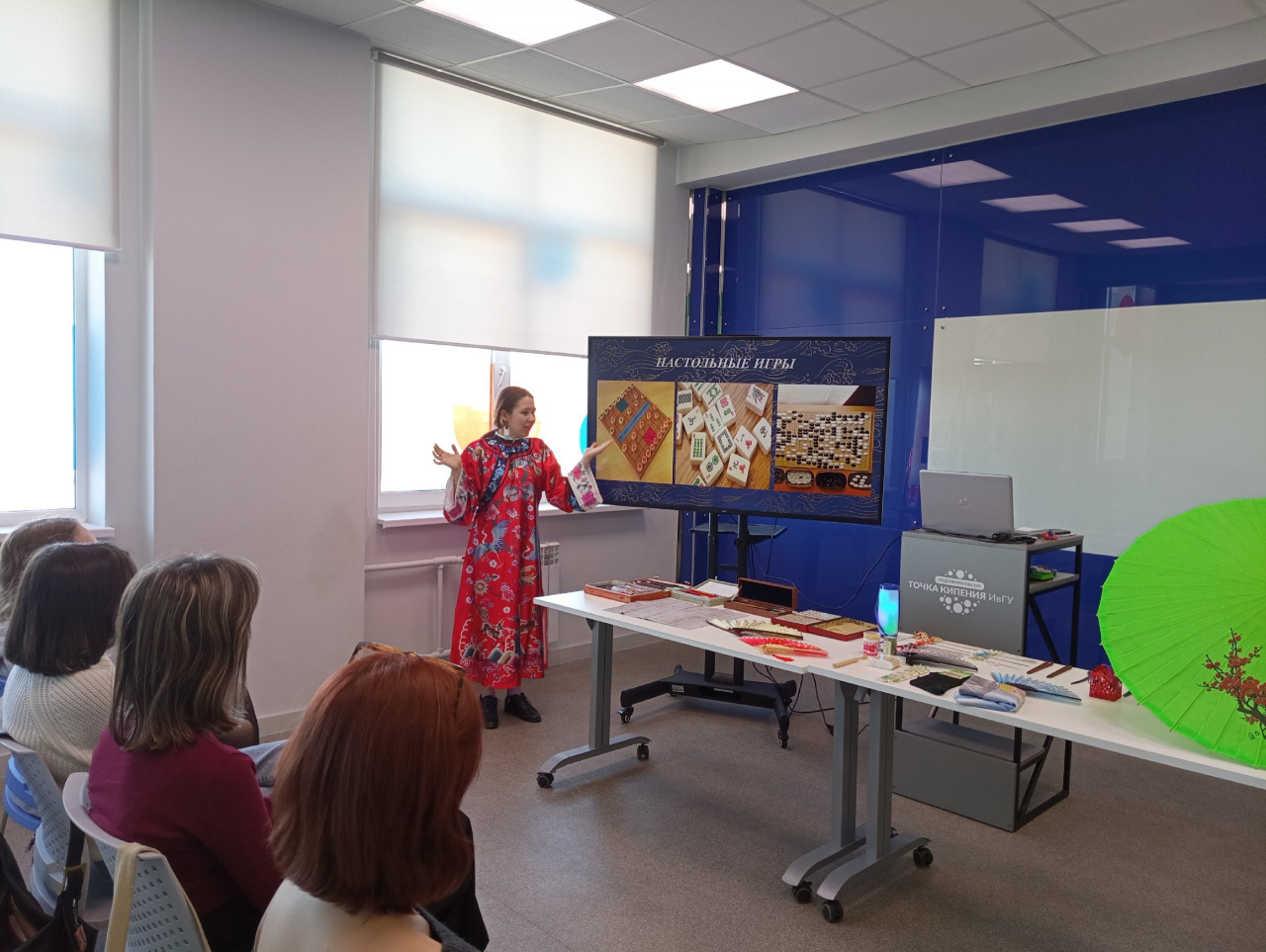 На мастер-классе по китайскому языку, который провела студентка направления «Педагогическое образование (Обучение иностранным языкам)» Элина Кадырова, участники смогли познакомиться с культурой Китая, узнать строгие правила проведения традиционной чайной церемонии, поупражняться с бамбуковыми палочками, послушать китайскую музыку и даже попробовать себя в роли каллиграфа. Тематическая викторина показала, что современная молодежь неплохо ориентируется в китаистике – ребята называли имена самых известных китайских мыслителей, угадывали культурные символы страны, объясняли различные приметы и ритуалы и т.д.