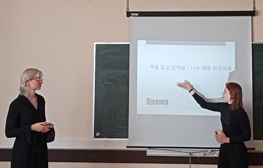На воркшопе по корейскому языку, организаторами которого выступили студентки направления «Филология (Зарубежная филология)» Анна Федорова и Анастасия Никитина, участники выучили несколько самых распространенных фраз, уделив значительное время для тренировки особого интонационного рисунка и сложной звуковой системы. Наставники поделились наиболее эффективными методиками для запоминания начертания букв корейского алфавита, раскрыли некоторые секреты мнемотехники. Не обошли вниманием и корейские дорамы, пользующиеся высоким индексом зрительского интереса в России.