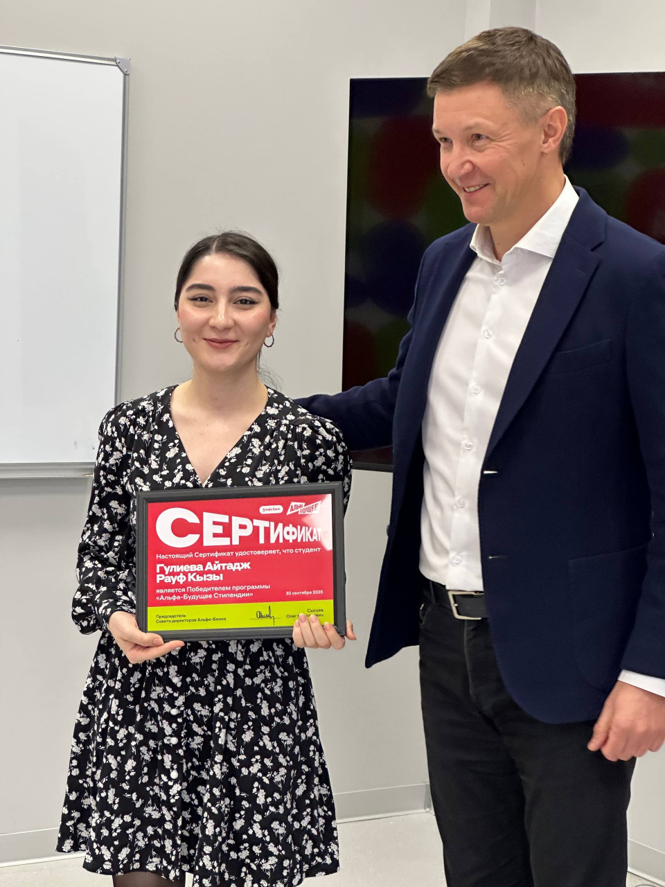 Напомним, что стипендиатами программы «Альфа будущее» стали восемь студентов ИвГУ: Мужжакова Екатерина, Носов Александр, Галстян Арман, Гулиева Айтадж, Кузьмина Александра, Исайчева Дарья, Хранилова Елизавета, Байдала Дарья. В течение 2025-2026 учебного года каждый из них ежемесячно будет получать стипендию от Альфа-Банка в размере 5 000 рублей.