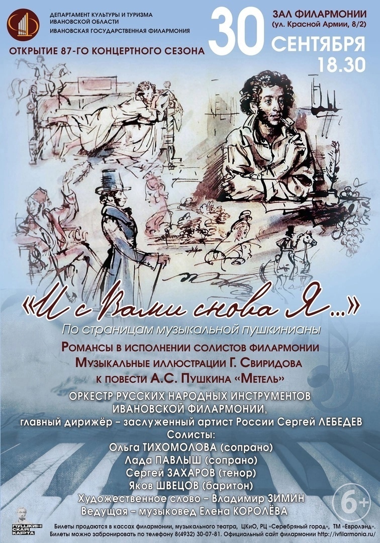 30 сентября, в 18.30, в рамках творческого марафона, посвященного открытию нового, 87-го, концертного сезона, Ивановская государственная филармония приглашает на программу «И с Вами снова я…» по страницам музыкальной Пушкинианы.