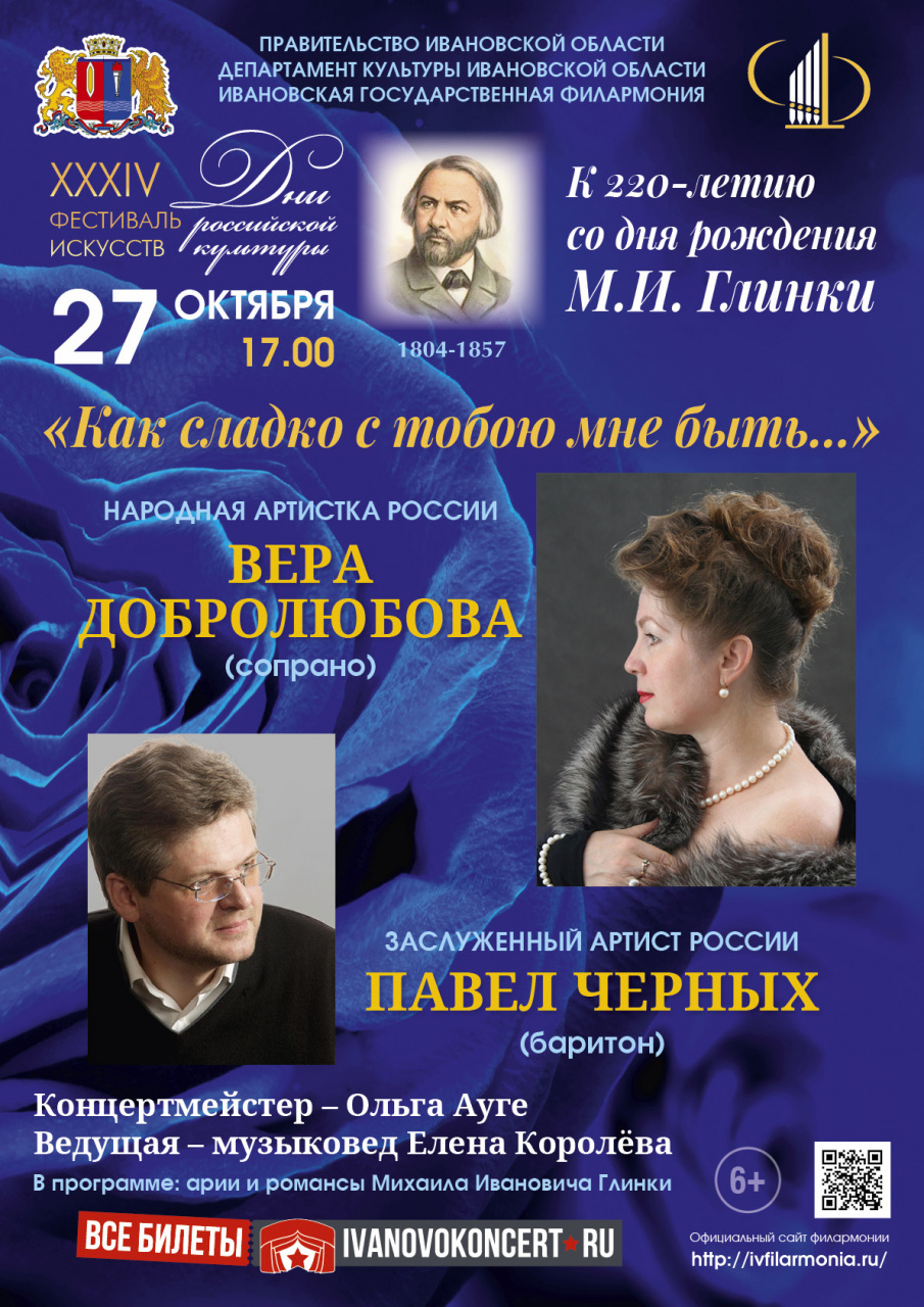27 октября в 17-00 в рамках XXXIV фестиваля искусств «Дни российской культуры» Ивановская государственная филармония приглашает на концертную программу «Как сладко с тобою мне быть...», посвященную 220-летию со дня рождения М.И. Глинки. Солисты: народная артистка России Вера Добролюбова (сопрано г. Иваново) и заслуженный артист России Павел Черных (баритон. г. Москва). Партия фортепиано – Ольга Ауге. Ведущая – музыковед Елена Королева.В концерте прозвучат арии и романсы Михаила Ивановича Глинки.