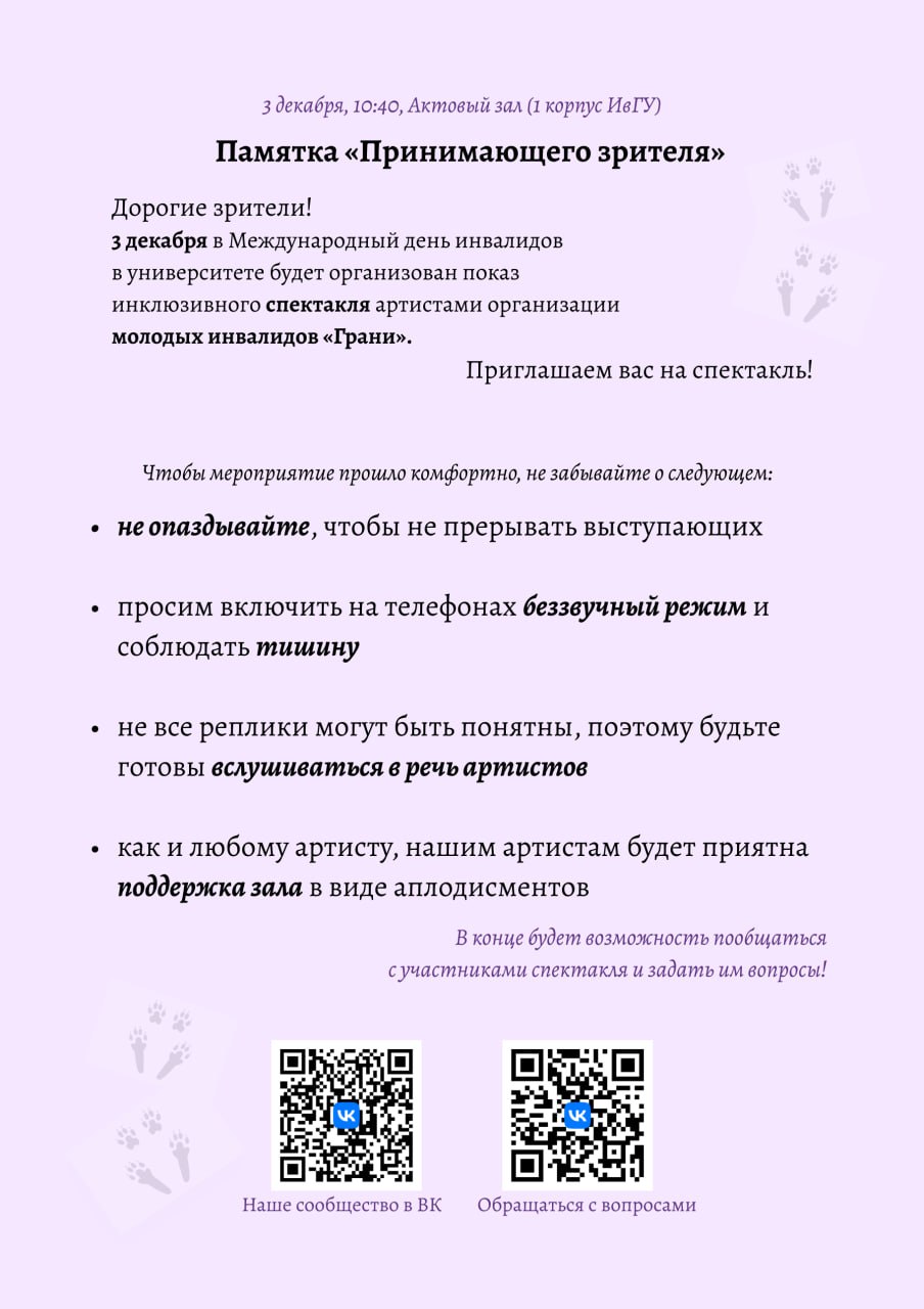 3 декабря в 10:40, в Международный день инвалидов, в университете будет организован показ инклюзивного спектакля артистами организации молодых инвалидов «Грани». Приглашаем вас на спектакль. Зрителей просим учесть пожелания, указанные в памятке «Принимающего зрителя».