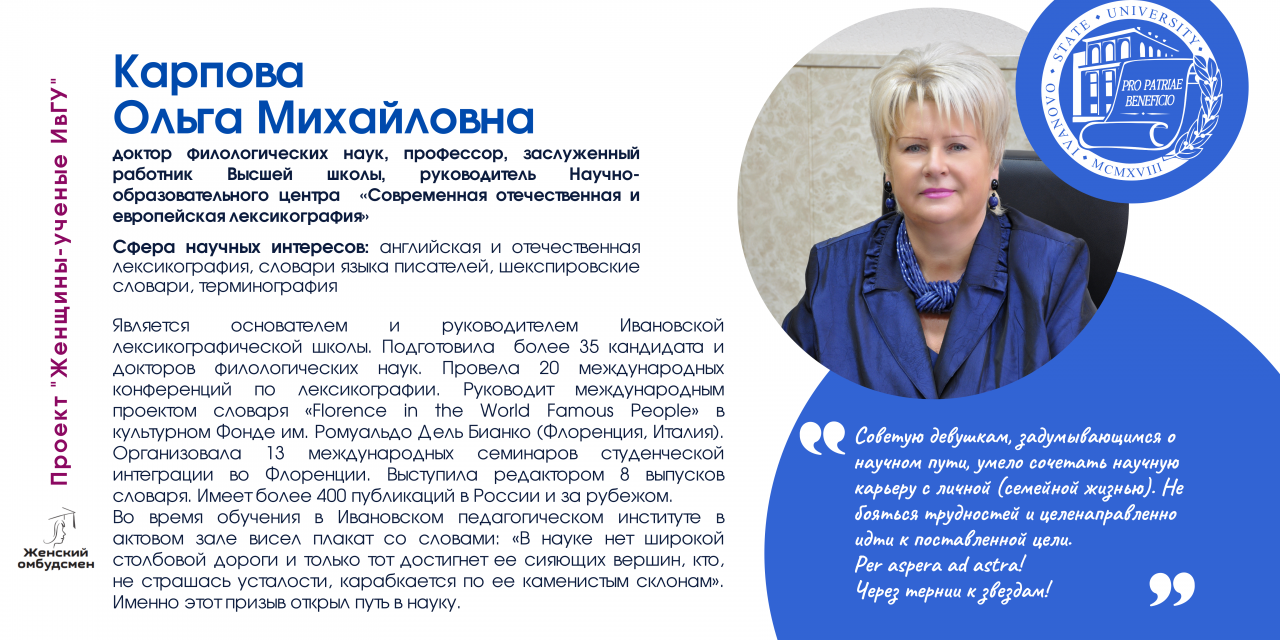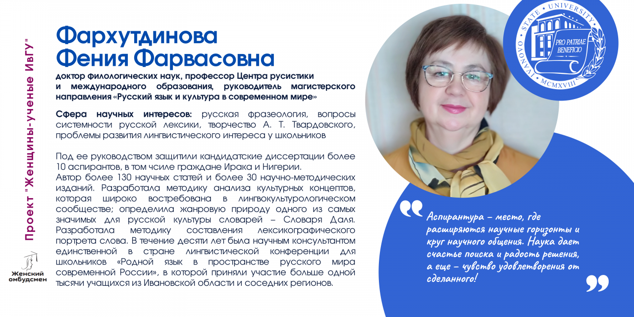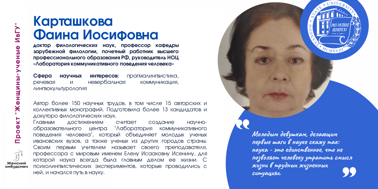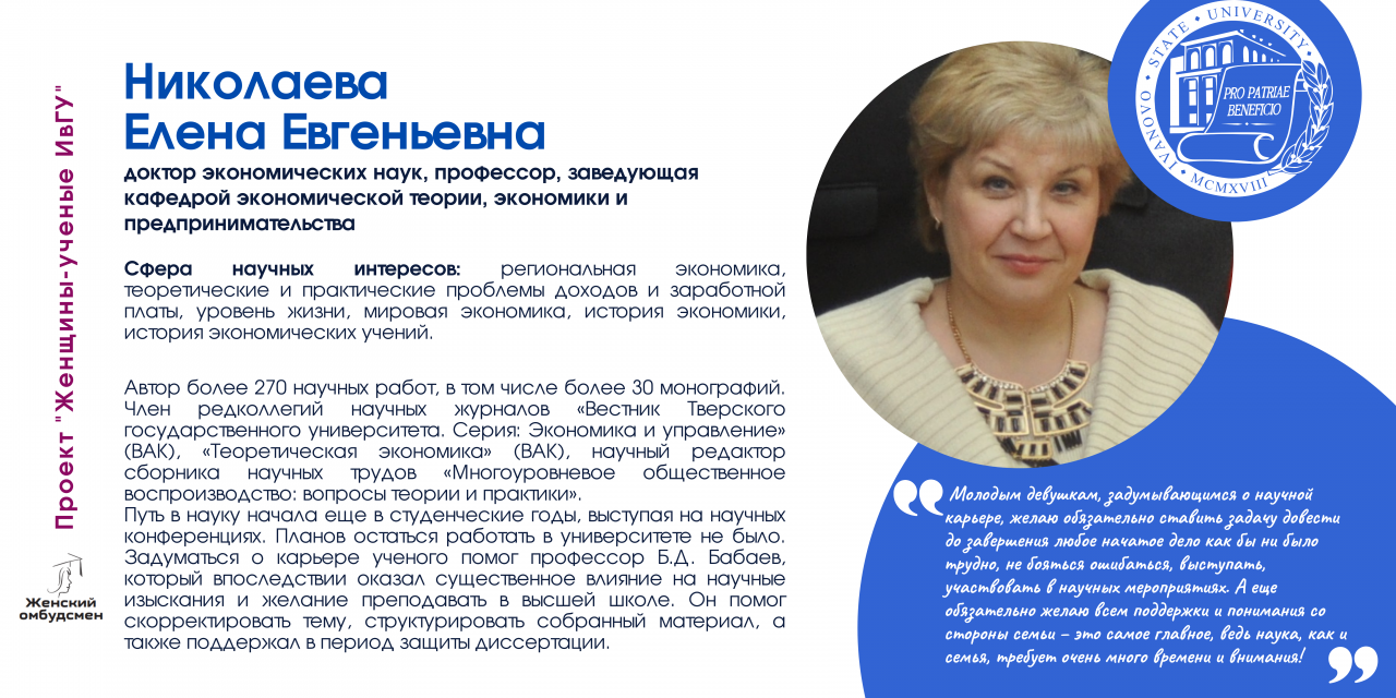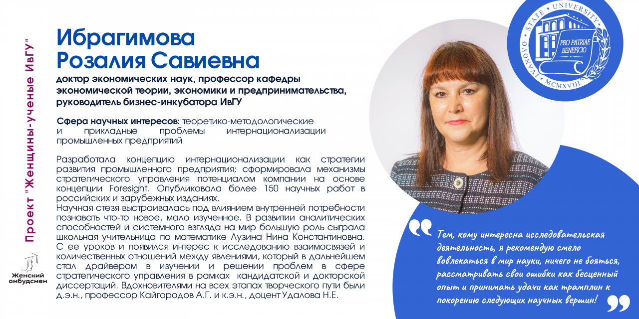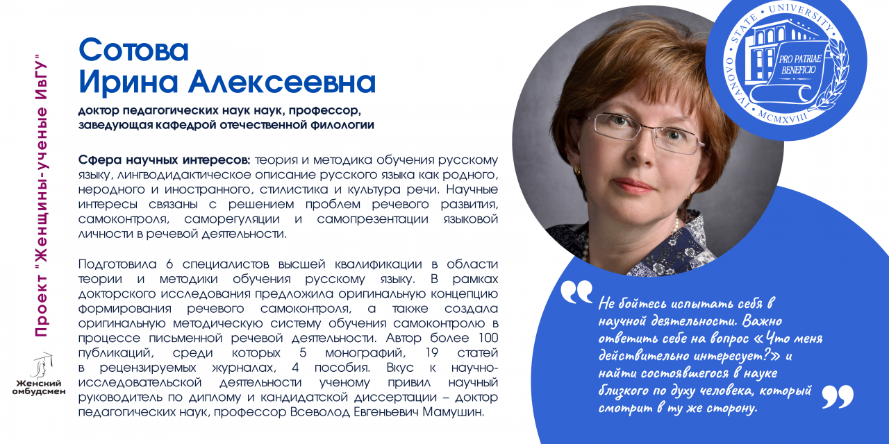В Ивановском государственном университете работают 170 женщин-ученых, в том числе 26 докторов и 112 кандидатов наук. В последнее время увеличилось число молодых исследовательниц (47 чел.).