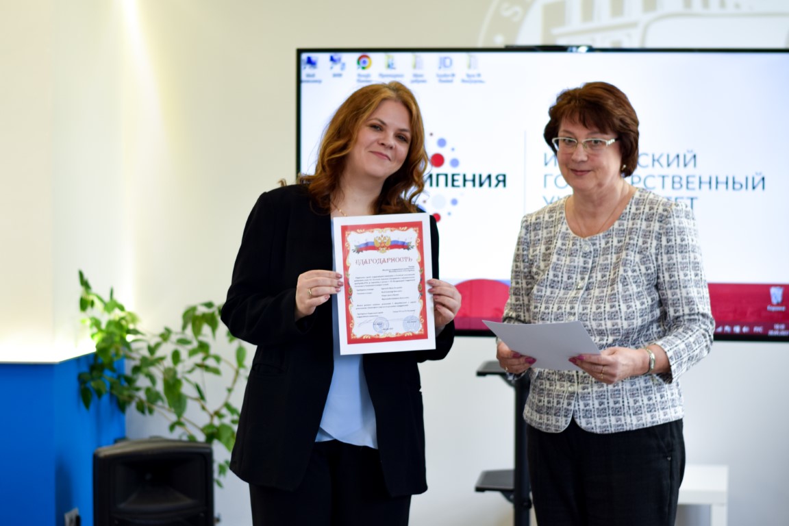О.В. Гусева в свою очередь вручила Благодарность на имя ректора ИвГУ, поблагодарила коллектив университета за давнее взаимодействие и отметила важность подписания совместной «дорожной карты» на уровне Росстата. Также она наградила Сертификатами участников XII Международной студенческой олимпиады по статистике, активных студентов ИвГУ – Артема Юрьевича Найдича, Александра Николаевича Носова и Екатерину Анатольевну Мужжакову. Напомним, награждение авторов лучших докладов региональной конференции дипломами, подписанными ректорами всех вузов региона, пройдет 23 мая в 14:00 на закрытии конференции в Музейно-выставочном центре (ИГИКМ им. Д.Г. Бурылина).