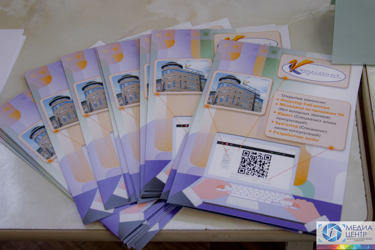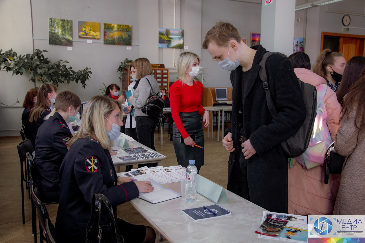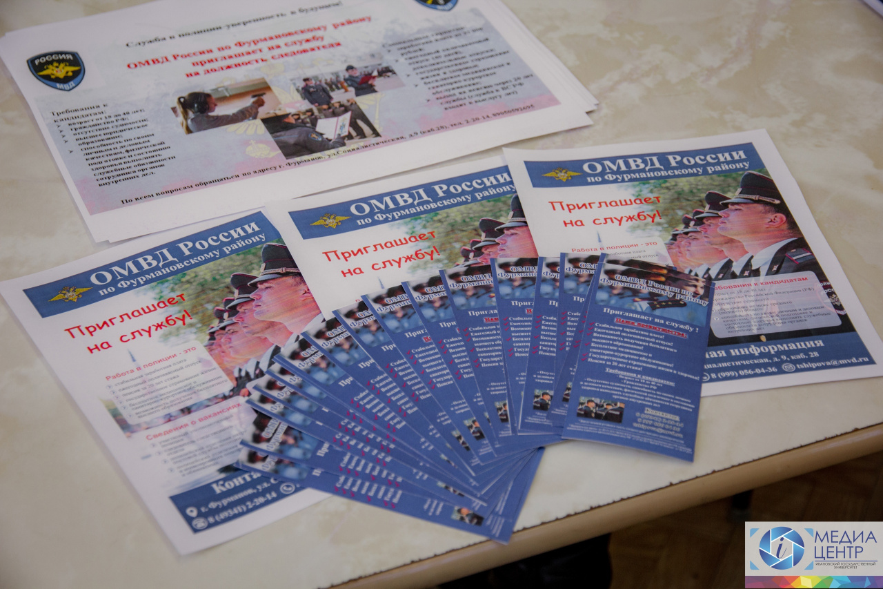 Далее молодым людям было предложено послушать информацию о службе по контракту и всех ее привилегиях. Остальные присутствующие спустились в читальный зал 1-го корпуса, где прошла сама ярмарка вакансий. Много различных организаций приняли участие в данном мероприятии, чтобы помочь молодым выпускникам и студентам найти свое место в жизни. Можно назвать такие организации, как ОМВД РФ, ОБ ДПС ГИБДД, АО «СОГАЗ», Бюро переводов «Дэйтабридж», Involta, УФНС России по Ивановской области, Департамент финансов Ивановской области, Центр управления регионом, Пункт отбора на военную службу по контракту, ООО «Интер РАО-управление сервисами», Институт профессионального развития ИвГУ, сеть центров дополнительного образования «Юниум» – и др. Выпускникам были предложены вакансии на государственной и гражданской службе, в коммерческих организациях на полную и частичную занятость, а также летние стажировки и базы для прохождения производственной практики. Проводились первичные собеседования и анкетирования.