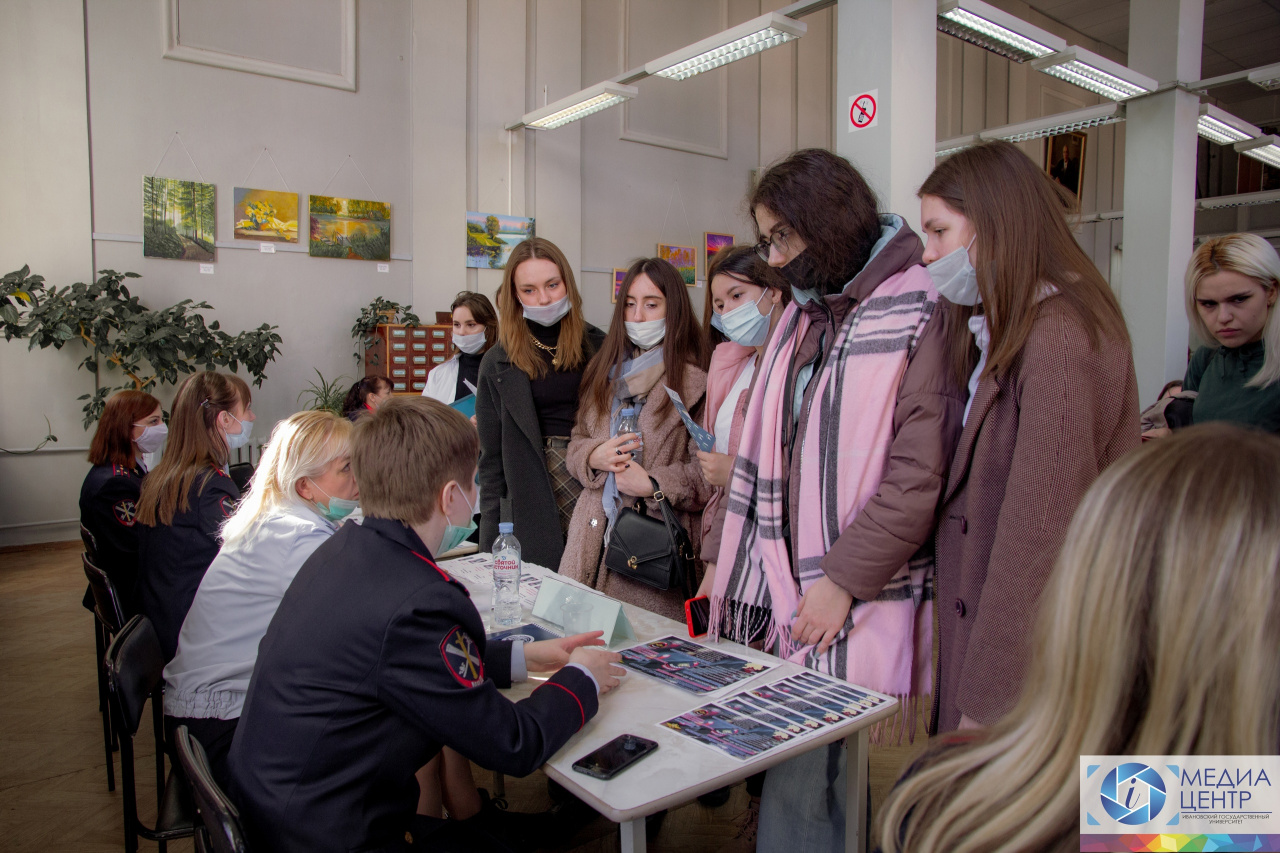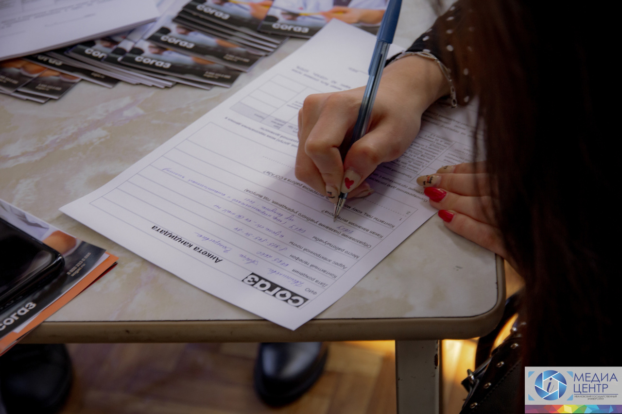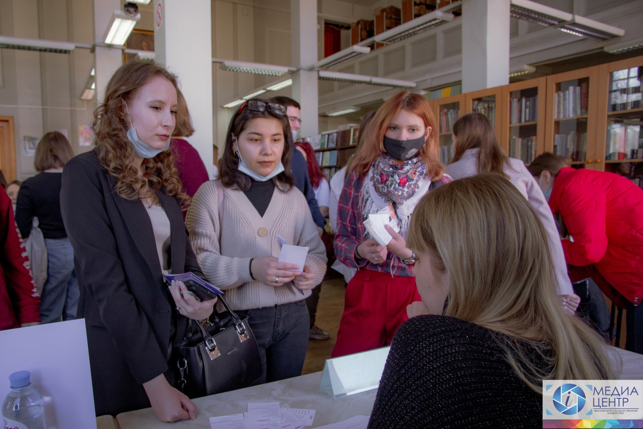Далее молодым людям было предложено послушать информацию о службе по контракту и всех ее привилегиях. Остальные присутствующие спустились в читальный зал 1-го корпуса, где прошла сама ярмарка вакансий. Много различных организаций приняли участие в данном мероприятии, чтобы помочь молодым выпускникам и студентам найти свое место в жизни. Можно назвать такие организации, как ОМВД РФ, ОБ ДПС ГИБДД, АО «СОГАЗ», Бюро переводов «Дэйтабридж», Involta, УФНС России по Ивановской области, Департамент финансов Ивановской области, Центр управления регионом, Пункт отбора на военную службу по контракту, ООО «Интер РАО-управление сервисами», Институт профессионального развития ИвГУ, сеть центров дополнительного образования «Юниум» – и др. Выпускникам были предложены вакансии на государственной и гражданской службе, в коммерческих организациях на полную и частичную занятость, а также летние стажировки и базы для прохождения производственной практики. Проводились первичные собеседования и анкетирования.