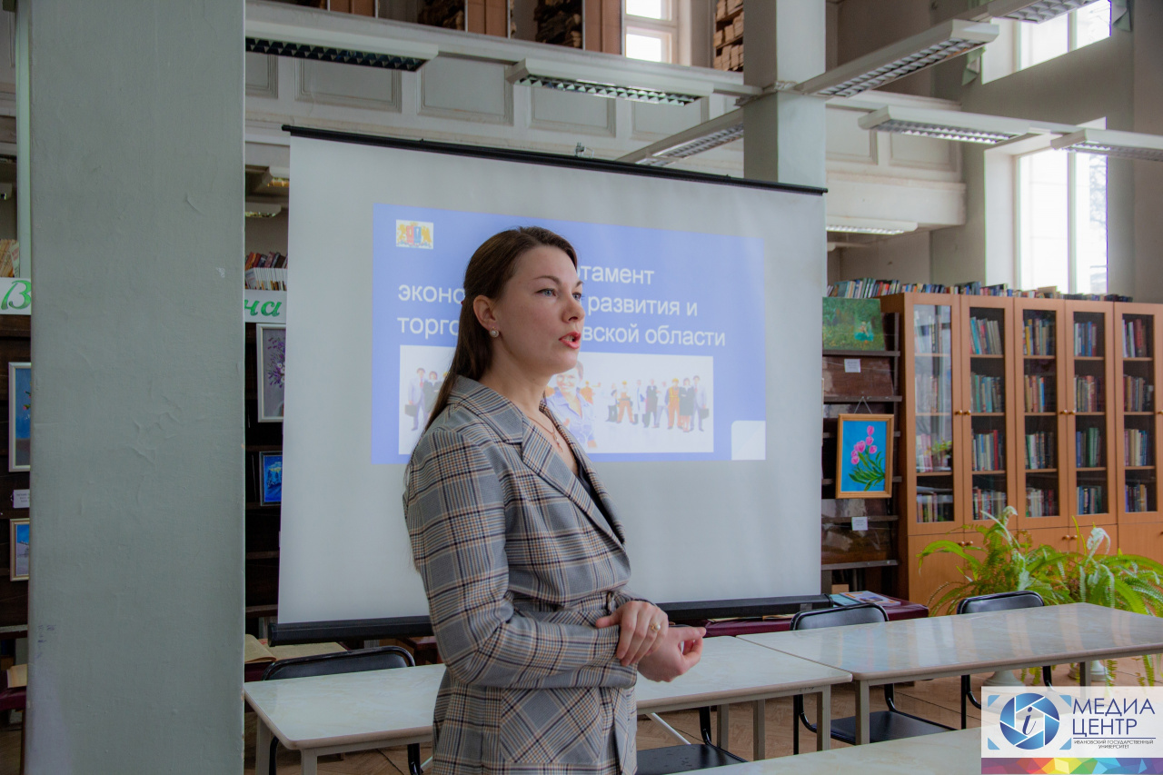 Также одним из первых мероприятий этой недели стала прошедшая в читальном зале 1-го корпуса встреча с заместителем директора Департамента экономического развития и торговли Ивановской области Юлией Геннадьевной Капраловой. В начале своего выступления Юлия Геннадьевна рассказала о руководящем составе департамента, а также о том, что студенты направления «Экономика» проходят там практику и могут устроиться на работу без конкурса. В процессе диалога были подняты вопросы о нюансах трудоустройства и размере заработной платы. Студенты получили очень важную информацию о том, что они могут зарегистрировать себя как самозанятые и получать стаж, который поспособствует дальнейшему карьерному продвижению. Ю.Г. Капралова рассказала студентам о важности написания правильного резюме. Она отметила, что резюме должно быть красочным и максимально раскрывать личность.